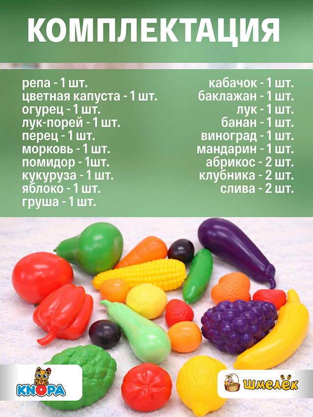 Наборы продуктов - популярная игрушка для ролевых игр. Дети с удовольствием используют муляжи овощей, фруктов, ягод в качестве ингредиентов для поварских игр, в качестве грузов для перевозки в машинках или для игр в магазин.
