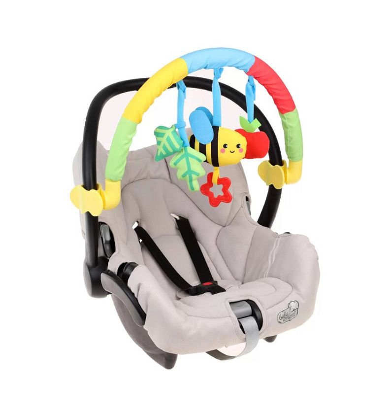 Дуга прикрепляется к бортику детской кроватки, к коляске или автокреслу при помощи специальных надёжных прищепок.