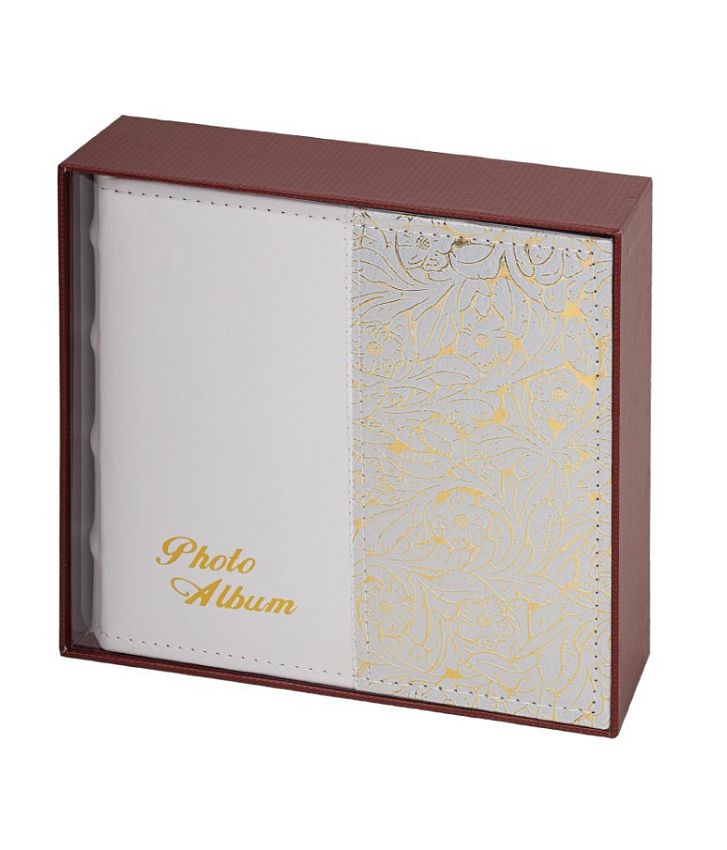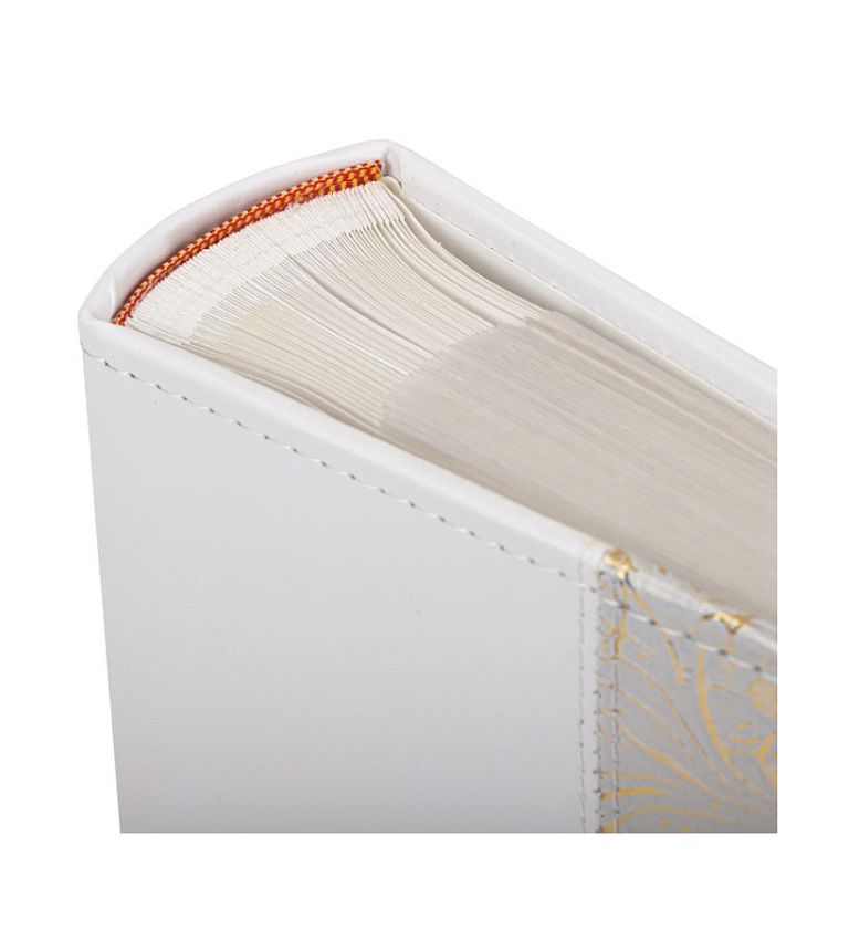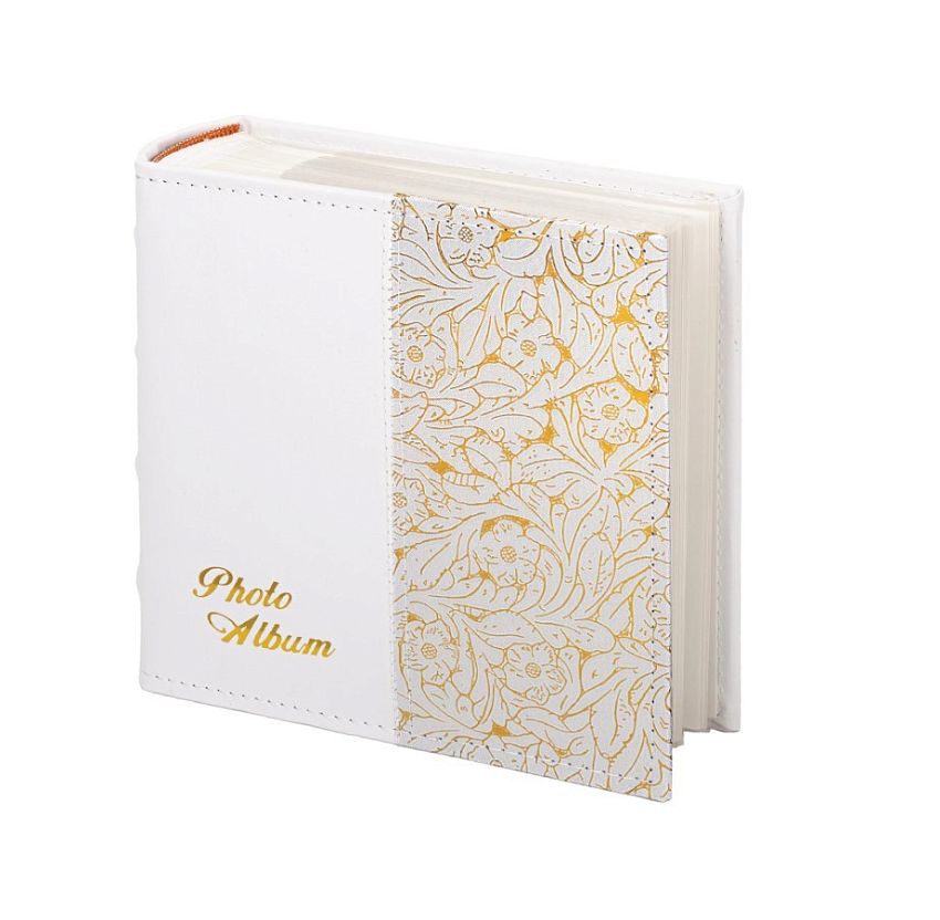 Состоит из 75 бумажных листов размером 15,5х21 см с карманами и вмещает 300 фотографий размером 10х15 см, по 2 штуки на странице. Обложка фотоальбома скомбинирована из материалов под гладкую и фактурную кожу белого и золотистого цвета. Фотоальбом с книжным переплетом отличается повышенной прочностью и долгим сроком службы. Имеются поля для подписей. Размер - 20,7х21,8 см.