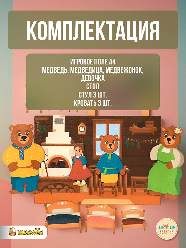 В комплект входит игровое поле формата А4, фигурки из фетра на липучках с изображением героев народных сказок и удобный карман для хранения. Персонажи русских сказок: медведь, медведица, медвежонок, девочка, а также стол, стул 3 шт., кровать 3 шт. Всего в наборе: 11 элементов.