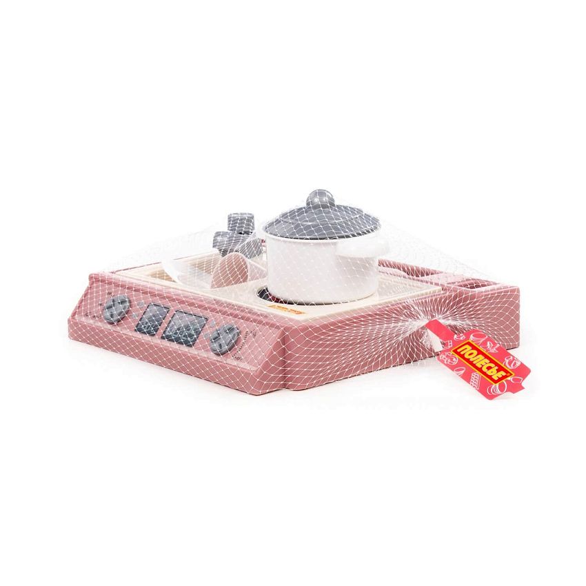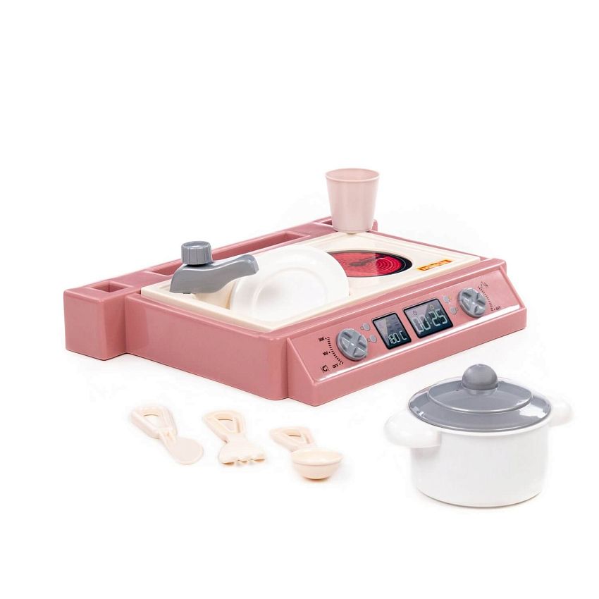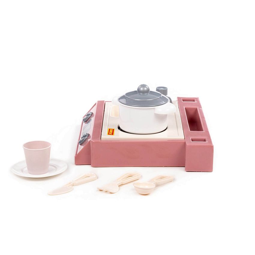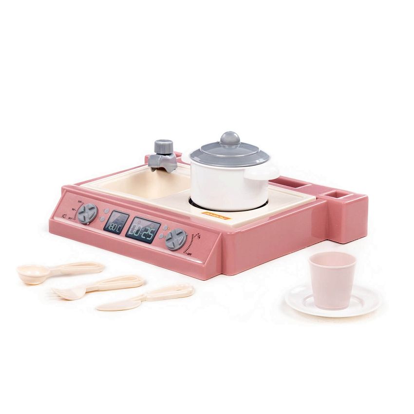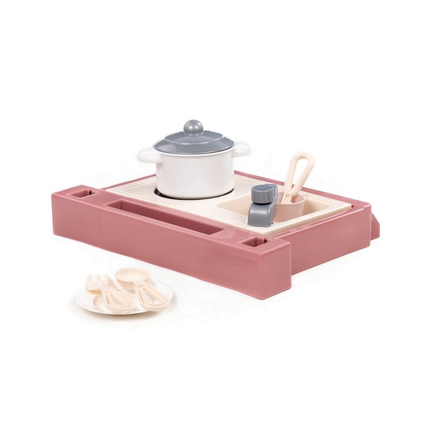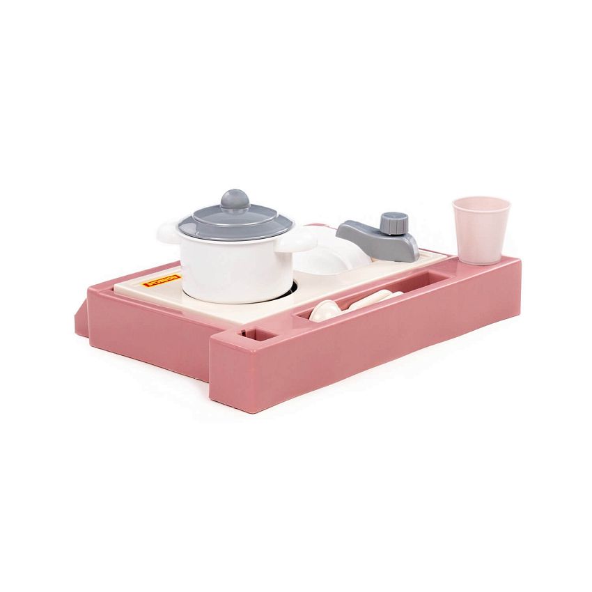 Маленький настольный набор, совмещающий в себе плиту, мойку, а также набор посуды. В набор входит : - кастрюля – 1 шт., - блюдце – 1 шт. - стакан – 1 шт., - ложка – 1 шт., - вилка – 1 шт., - нож – 1 шт.