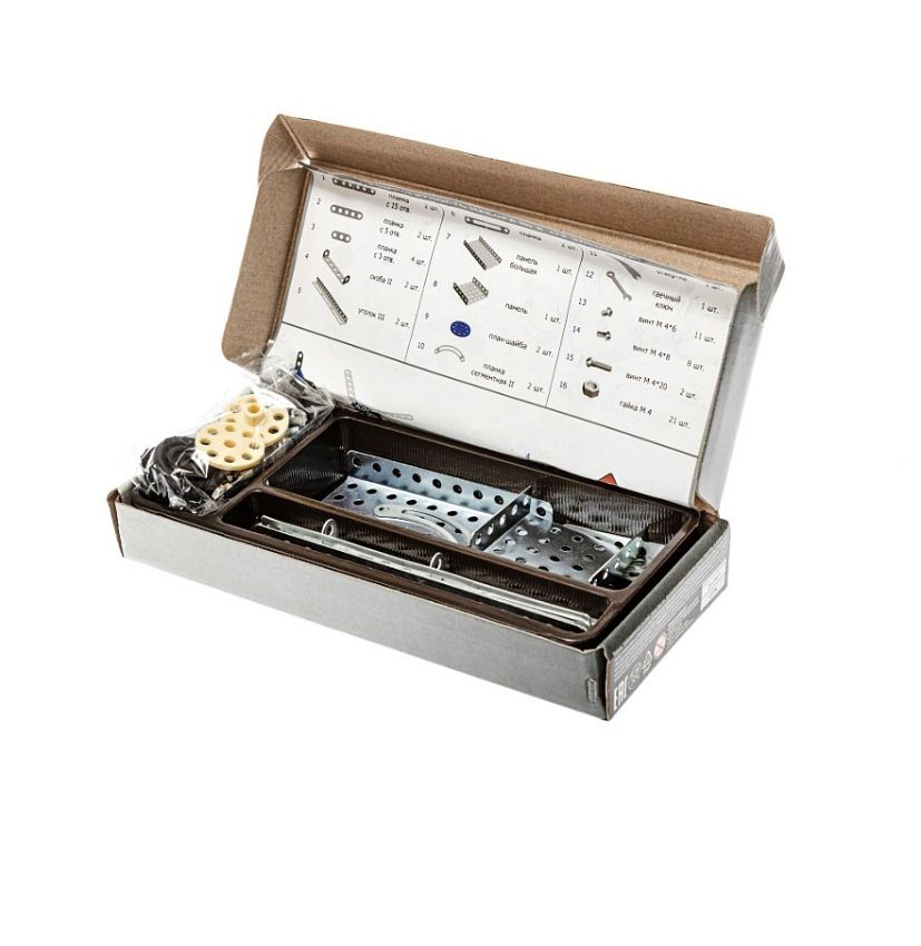 Из деталей набора можно собрать 2 несложные конструкции. Принцип сборки освоит даже первоклассник: детали прикручиваются друг к другу за счет множества отверстий для болтов. В дальнейшем, научившись собирать модели с помощью инструкции по сборке, ребёнок сможет перейти к самостоятельному конструированию моделей. Набор прекрасно развивает усидчивость, логику, пространственное мышление и мелкую моторику.