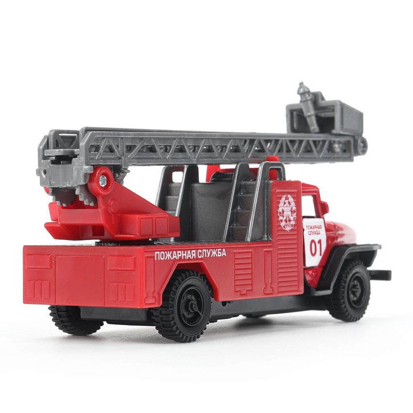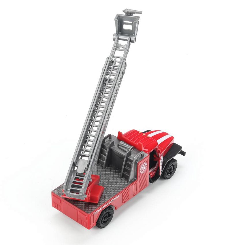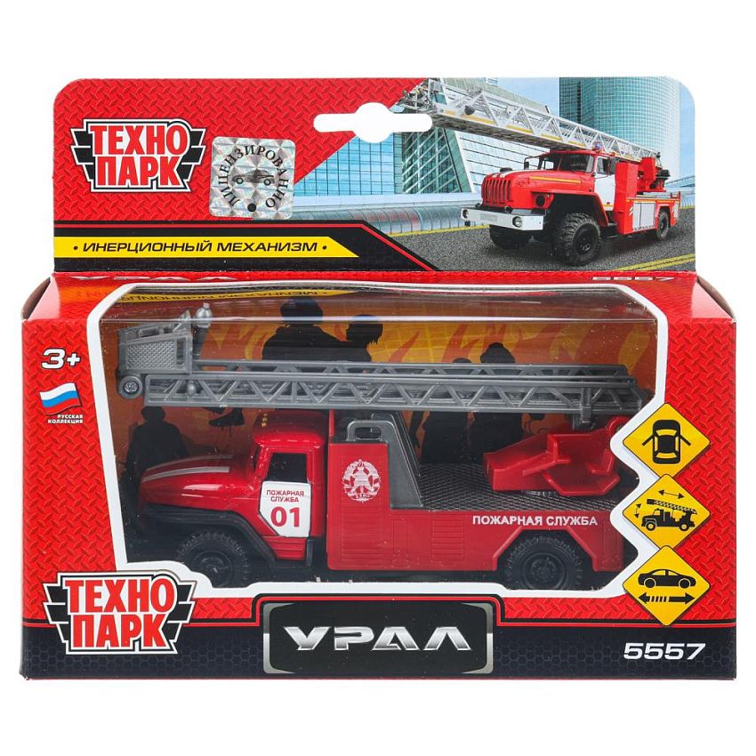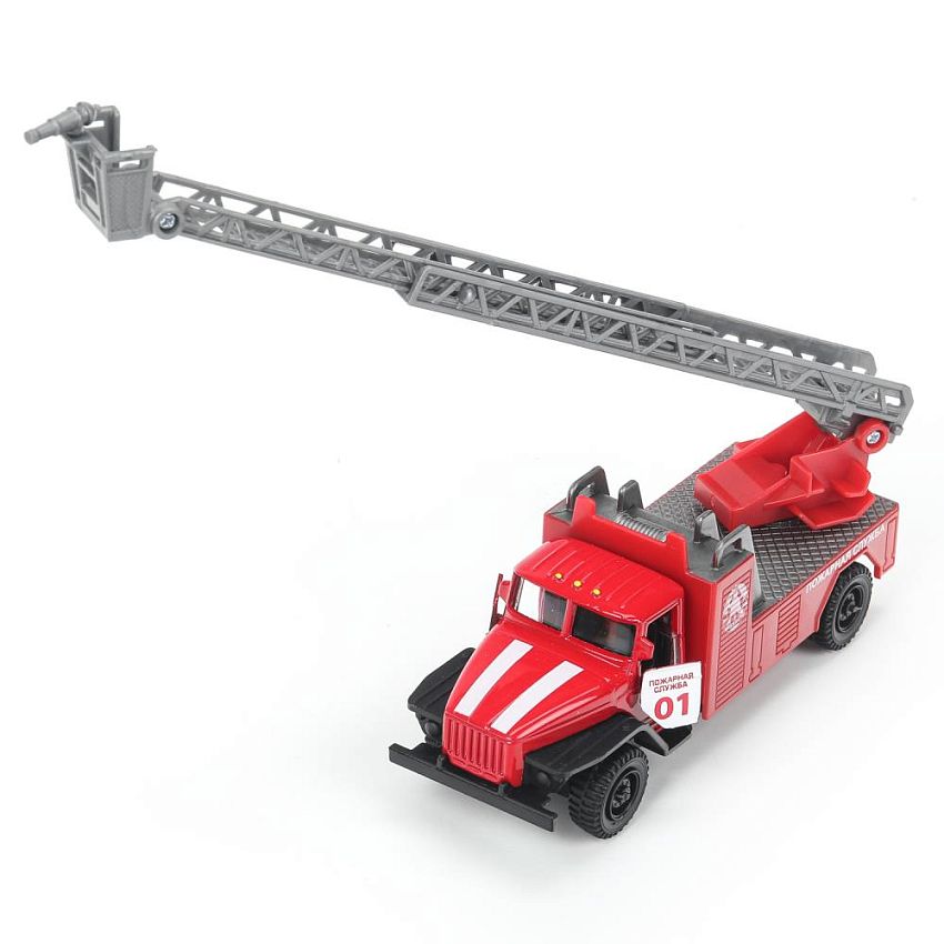 Игрушка выполнена реалистичной мини-копией автомобиля "Урал 5557" в дизайне пожарной. Кабина исполнена в ярком красном цвете, на дверях нанесены надписи «пожарная служба 01». Двери кабины открываются, благодаря чему можно рассмотреть, как тщательно она выполнена внутри. Игрушка порадует детей своей функциональностью: стрела машины поднимается и опускается, благодаря чему с ней можно имитировать тушение пожара. Автомобиль снабжён инерционным механизмом, благодаря чему может самостоятельно проезжать некоторые расстояния.