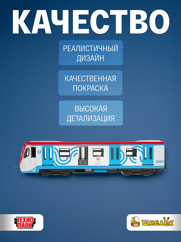 Электропоезд Технопарк выполнен с тщательной детализацией и сделан похожим на реальный головной вагон метро 81-765. Металлический корпус модели изготовлен с учетом технических особенностей прототипа и имеет бело-голубую окраску с красной полосой.