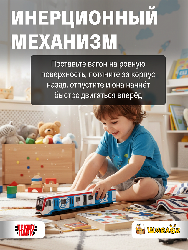 Металлический поезд метро оснащен инерционным механизмом: достаточно немного откатить игрушку назад, чтобы он самостоятельно поехал вперед. Благодаря этому процесс игры становится интереснее, у ребёнка появляется возможность совершенствовать мышление и воображение.