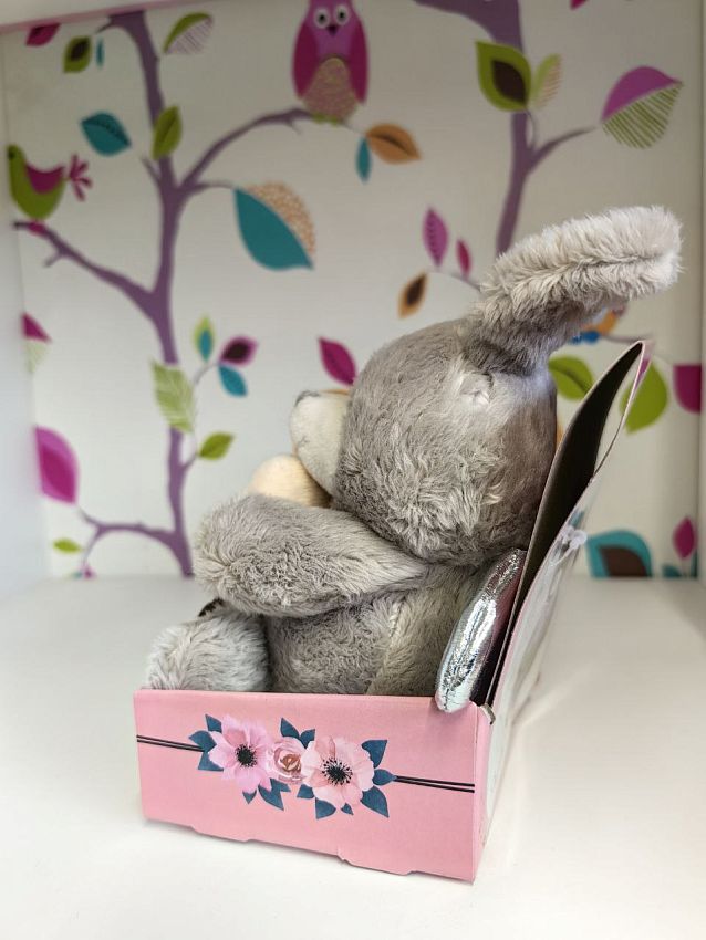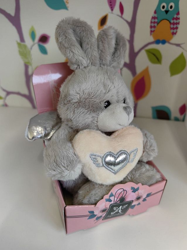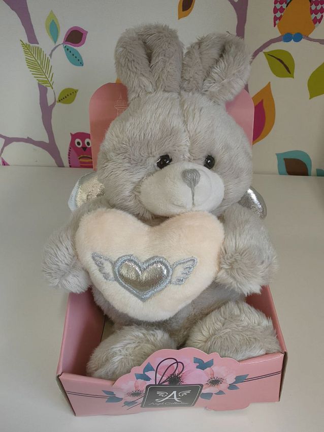 Очаровательные мягкие игрушки Валентинка представляет собой милого зайчика с серебристыми крылышками. В лапках зверят сердечки.