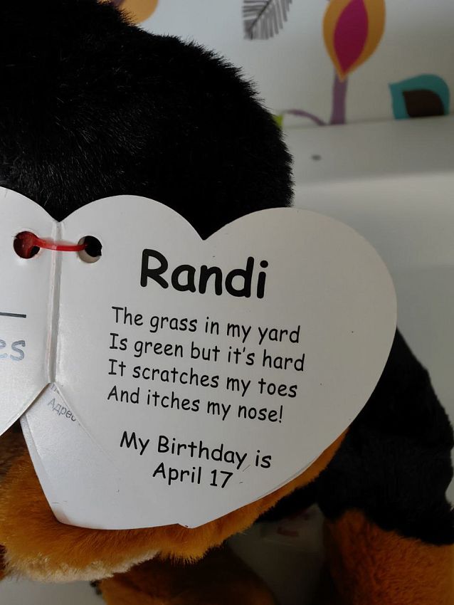 Плюшевый ротвейлер Рэнди от бренда TY, серии Beanie Babies – это самая известная мягкая игрушка бренда TY с нежной пушистой шерсткой и большими любознательными глазками! Благодаря своему очаровательному образу они привлекают внимание и детей, и взрослых. А компактный размер игрушки всего 15 см позволяет легко взять её с собой в путешествие. Серия Beanie Babies - это самые первые, оригинальные TY с тридцатилетней историей.
