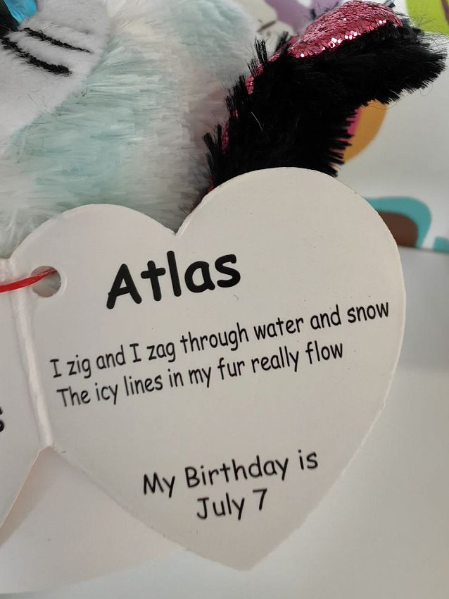 У каждого персонажа этой коллекции есть не только уникальное имя и дата рождения, но и стихотворение, относящееся к игрушке. Всё это Вы можете увидеть на его оригинальной этикетке-сердечке от TY. День рождения лисы Атлас 7 июля.