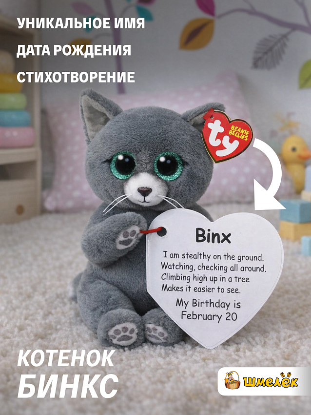 У каждого персонажа этой коллекции есть не только уникальное имя и дата рождения, но и стихотворение, относящееся к игрушке. Всё это Вы можете увидеть на его оригинальной этикетке-сердечке от TY. День рождения кота Бинкса 20 февраля.