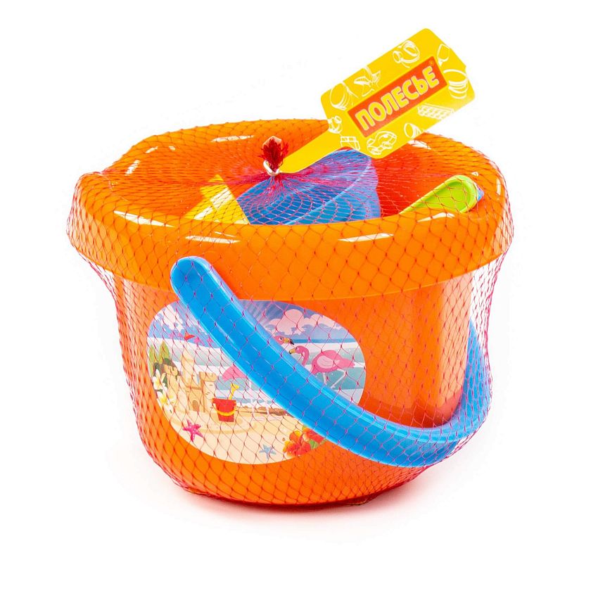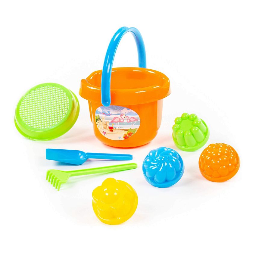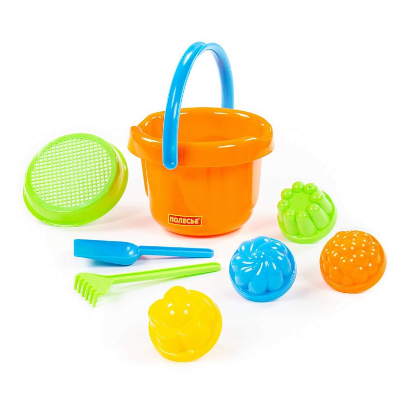 Ведро большое, ситечко, 4 формочки, лопатка, грабельки.