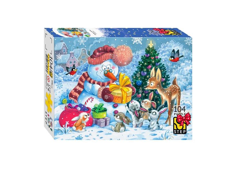 Пазл для ребенка состоит из 104 прочных деталей с красочными иллюстрациями любимых персонажей мультфильма. Игровой набор для мальчиков и девочек. Игра вызовет восторг у ребенка. Детали чуть больше стандартных, такие деткам будет удобно складывать в картинку. На картинке изображена волшебная зимняя сцена, где снеговик раздаёт подарки лесным жителям. Вокруг него собрались милые зверята: зайчата, косуля и птицы, с интересом и радостью принимающие подарки. Новогодняя ёлка с яркими шарами, создает праздничное настроение. Игра подойдет для развития мелкой моторики, внимания, памяти. Пазлы для детей 5 лет. Также подойдут пазлы для детей 6 лет 7 лет и старше.