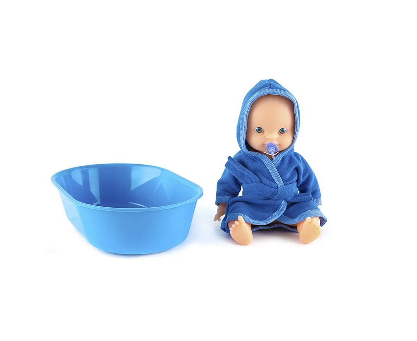 Пупс одет в банный халатик. У игрушки подвижные ножки, ручки и голова.