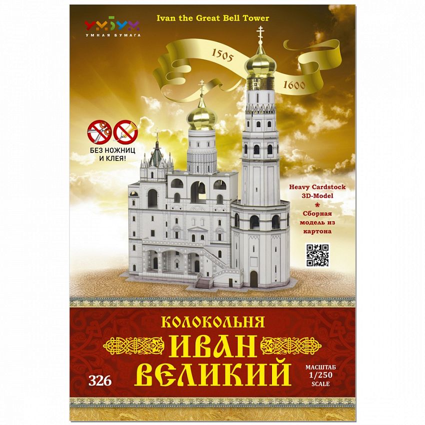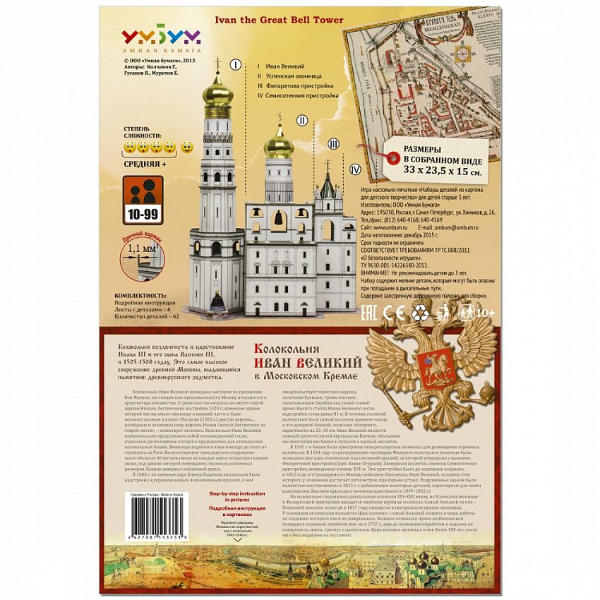 Колокольня Иван Великий — сборный архитектурный макет, произведенный компанией Умная Бумага. Выполнен в масштабе 1/250. Это означает, что модель в 250 раз меньше настоящего здания. Знаменитая колокольня — самое высокое здание древней Москвы, выдающийся памятник древнерусского зодчества. На макете показан и находящийся рядом царь-колокол. В комплекте листы с деталями и подробная инструкция в картинках. На рисунках шаг за шагом показан весь процесс сборки. Каждая деталь имеет свой номер и ее легко найти. Процесс сборки понравится каждому, независимо от возраста.