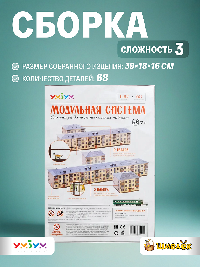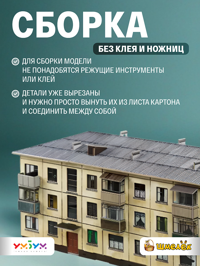 Модель Хрущевка СССР собирается без клея, а также не понадобятся режущие инструменты, что облегчает процесс, делает его доступным и безопасным для детей. Детали уже вырезаны, нужно просто вынуть их из картонного основания и соединить между собой по инструкции (прилагается).