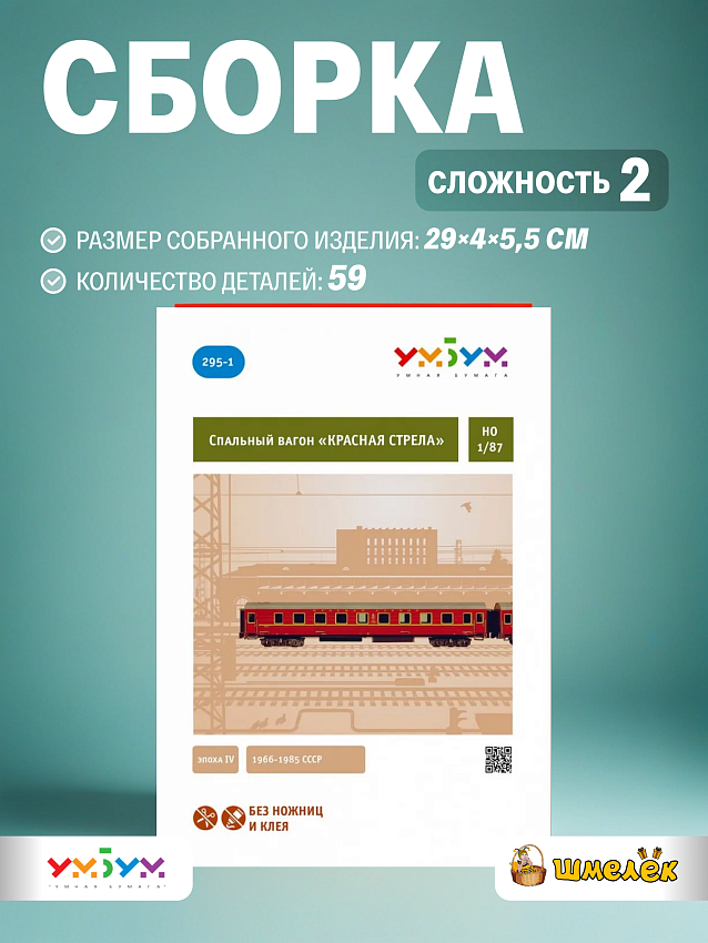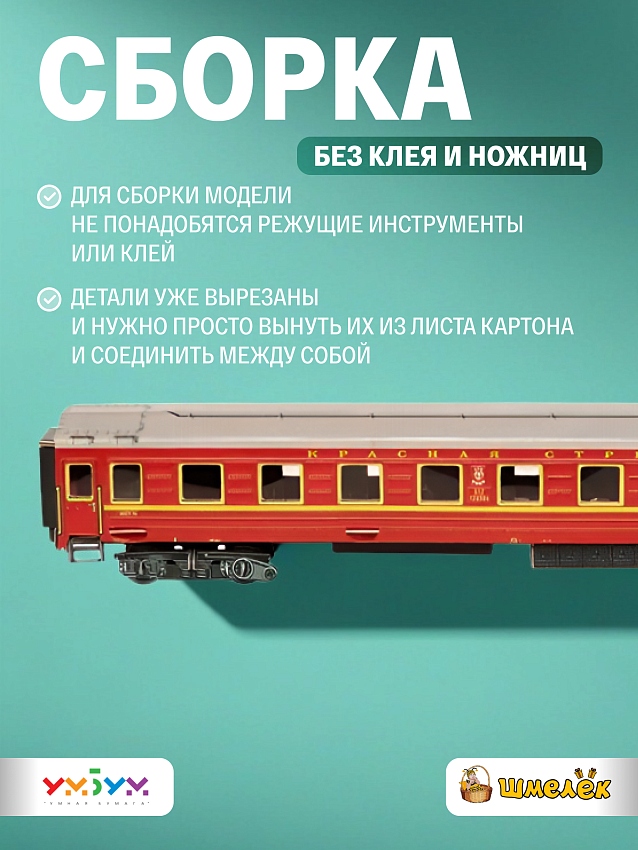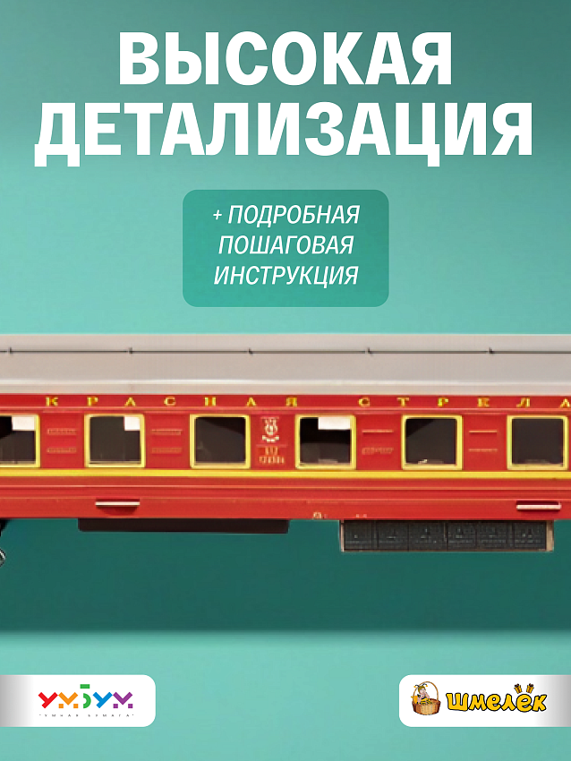 Сборная модель Умная Бумага Красная стрела УмБум295-1 представляет собой миниатюрную модель спального вагона, выполненную из плотного картона.
