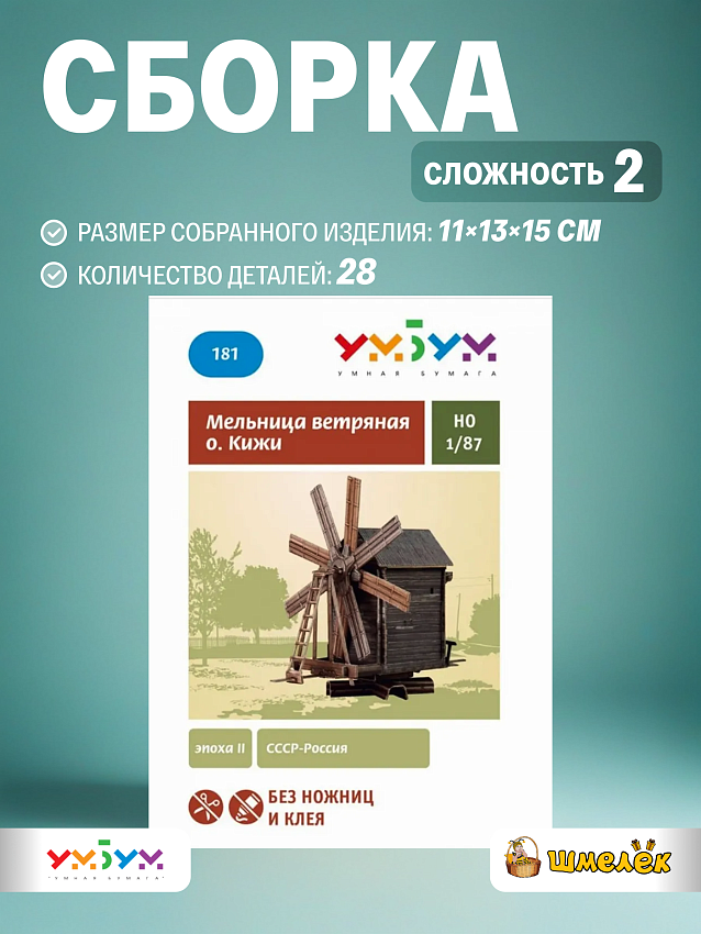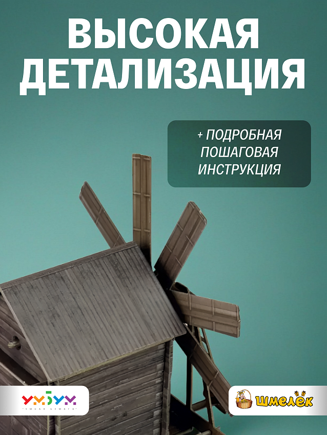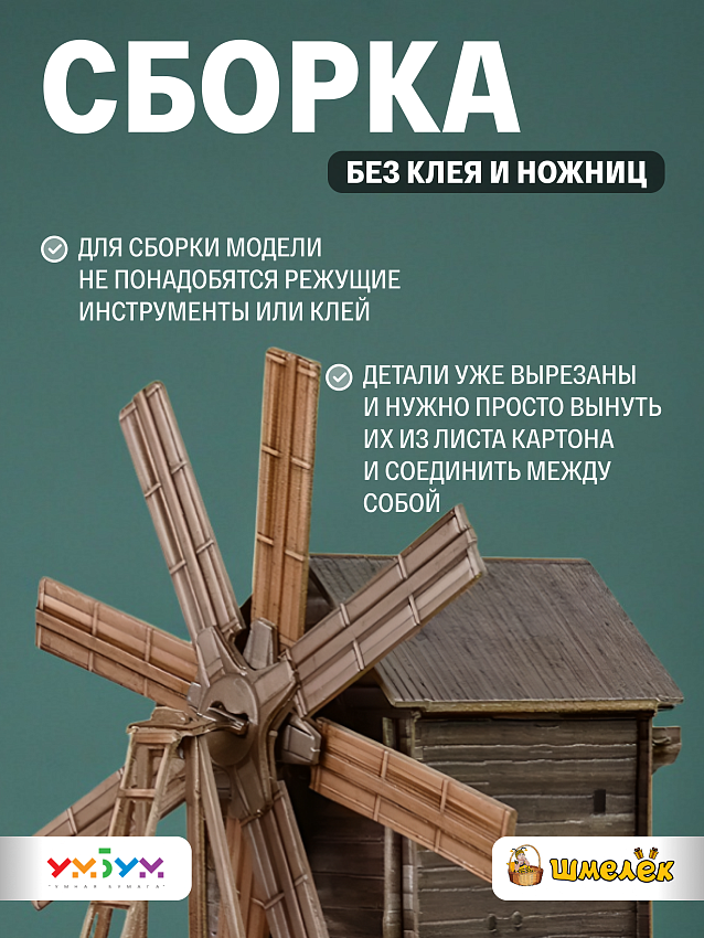 Картонный набор УмБум 181 является частью серии моделей Умная Бумага Архитектурные памятники, которые разрабатываются на основе чертежей и фотографий прототипов. Собирая макет мельницы своими руками, ребенок учится внимательности и аккуратности, а также развивает моторику и когнитивные навыки. Помимо образовательной функции это отличный способ провести время всей семьей за совместным занятием.