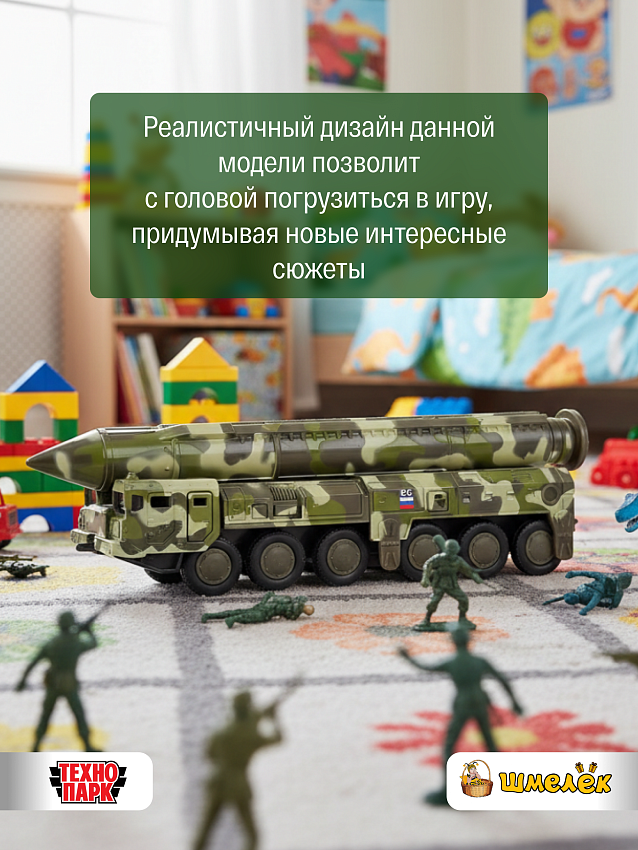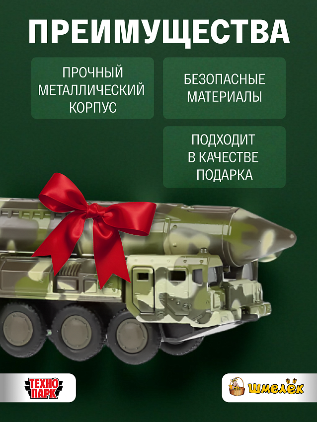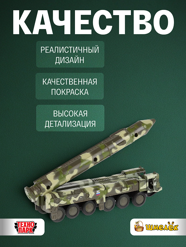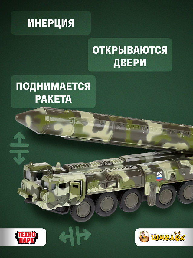 Металлическая модель подвижного грунтового ракетного комплекса стратегического назначения ''Тополь'' с межконтинентальной баллистической ракетой, в летней камуфляжной окраске, от ''Технопарк'', выполнена с учётом всех особенностей прототипа. Благодаря открывающимся передним дверям, которые делают машинку похожей на настоящую, всегда можно заглянуть к ней внутрь, чтобы убедиться - каждая деталь отлично проработана. Ракета поднимается и опускается.
