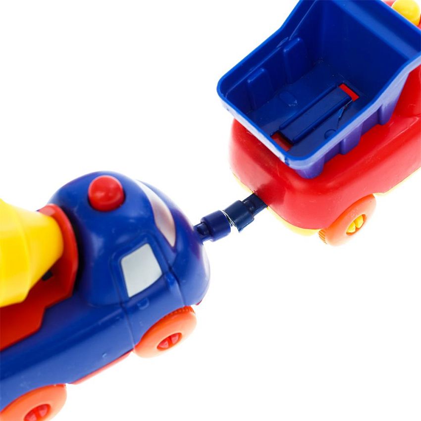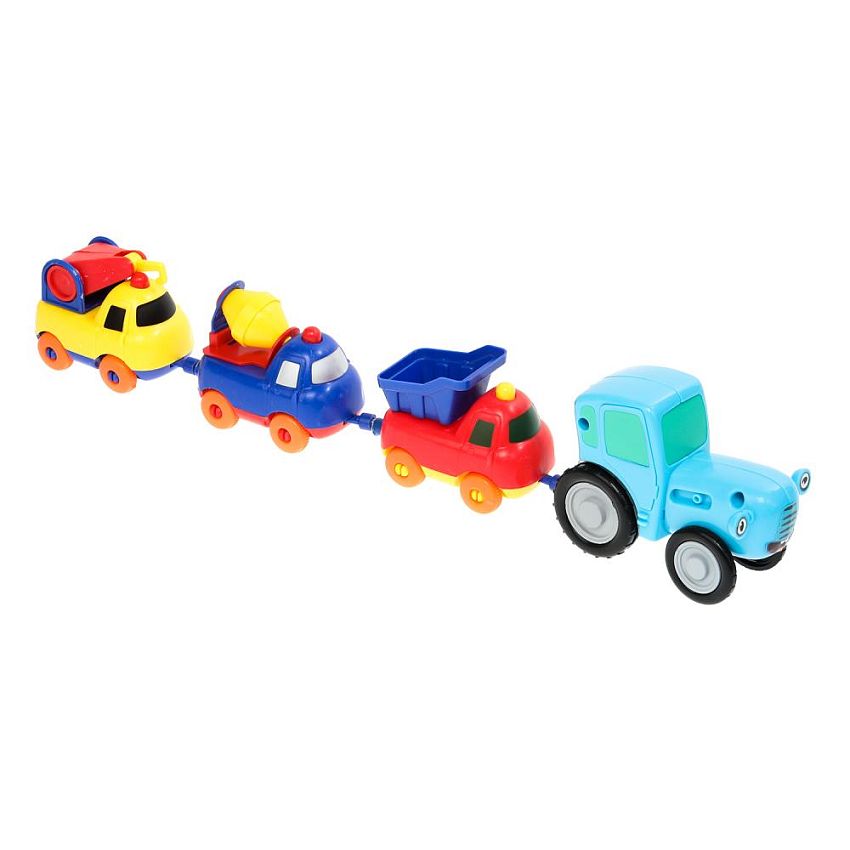 - Поезд состоит из синего трактора и трёх грузовиков, с лёгкой магнитной сцепкой. Все они выполнены в весёлой мультяшной окраске.