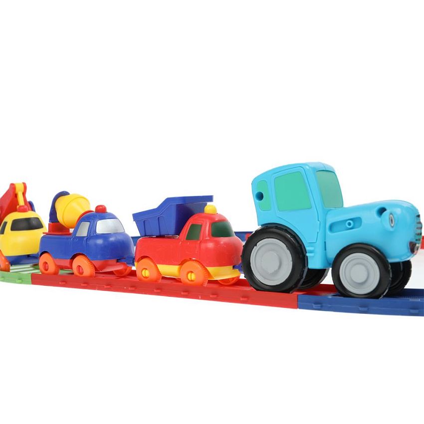 Данный набор железной дороги выполнен в виде героев популярного у малышей мультфильма ''Синий трактор''. В наборе представлены синий трактор, бетономешалка, самосвал и автокран, выполненные в ярком мультяшном виде.